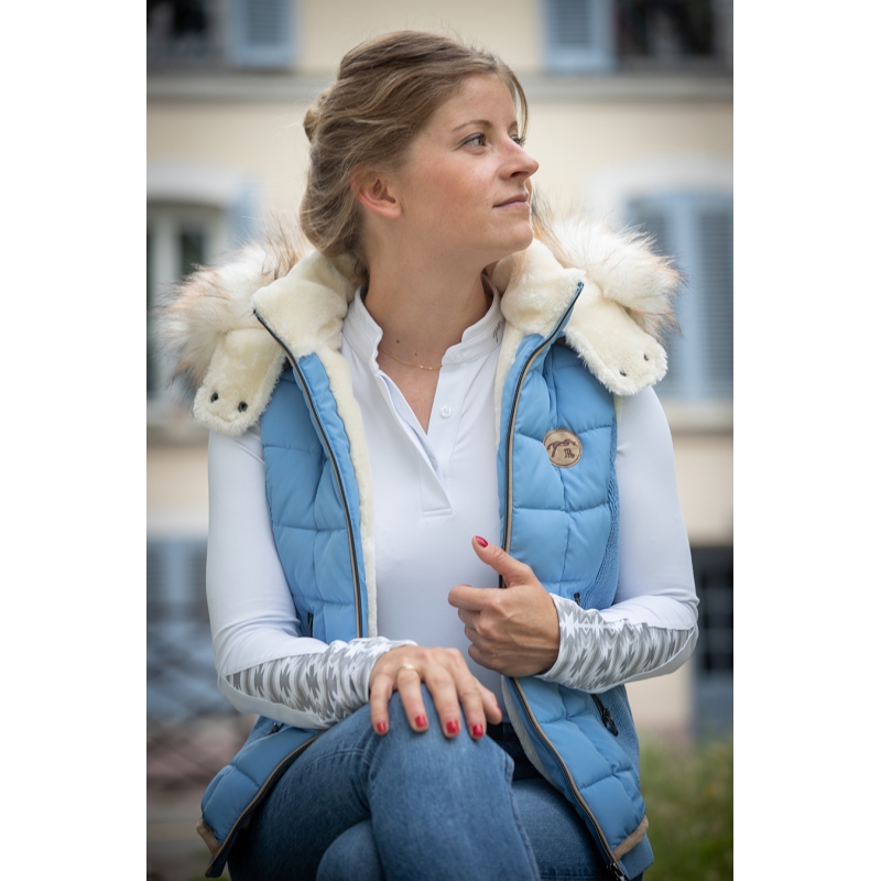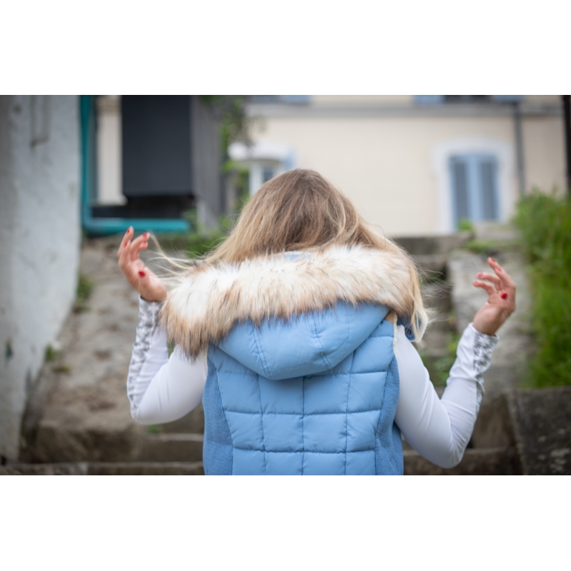 Un modèle bien connu des Collections Pénélope qui se décline ici en bleu arctique. Notre doudoune Roger est sans manches et doublée d'une polaire ultra-douce, bien chaude. Elle se ferme par une fermeture éclair centrale et est dotée d'une capuche rehaussée d'une magnifique fausse fourrure. Des bandes stretch sont insérées sur les côtés et sur le bas de la doudoune pour assurer un grand confort. Sur le cœur, on trouve un patch en simili-cuir patiné avec le logo de la marque en contraste. Sur les épaules, on trouve des inserts dans ce même simili-cuir. Le long de la fermeture éclair et en arrondi en bas, un galon dans une matière similaire apporte une belle finition. Enfin, on trouve deux poches zippées à l'avant.
