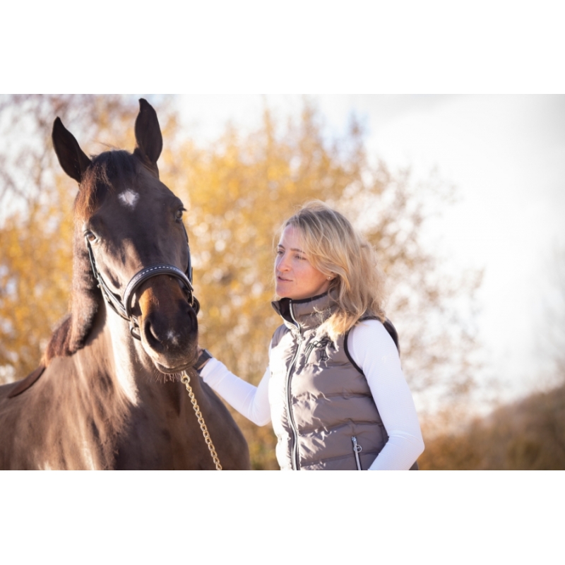 La doudoune sans manches Anouck des collections Pénélope est proposée dans un joli matelassage bien épais et gris. Elle est orné d'un galon foncé, en contraste en haut du col, tout en bas du vêtement et autour des emmanchures. Elle est idéale pour être libre de ses mouvements à cheval comme à pied. Elle garde aussi parfaitement la chaleur pendant la saison froide, par dessus un pull ou sous un blouson. Elle a deux poches zippées sur le devant et un col montant qui isole bien du froid. Le logo Pénélope est brodé en 3D sur le cœur.