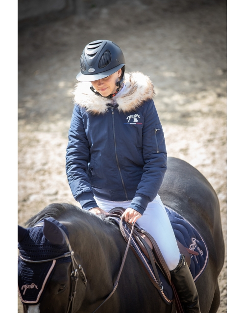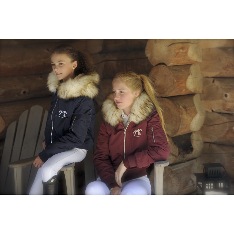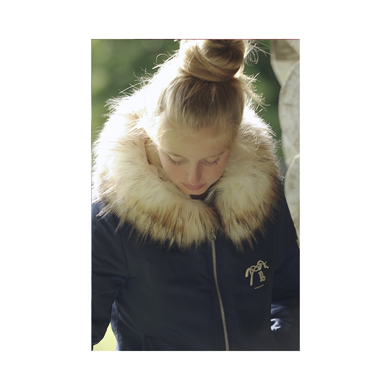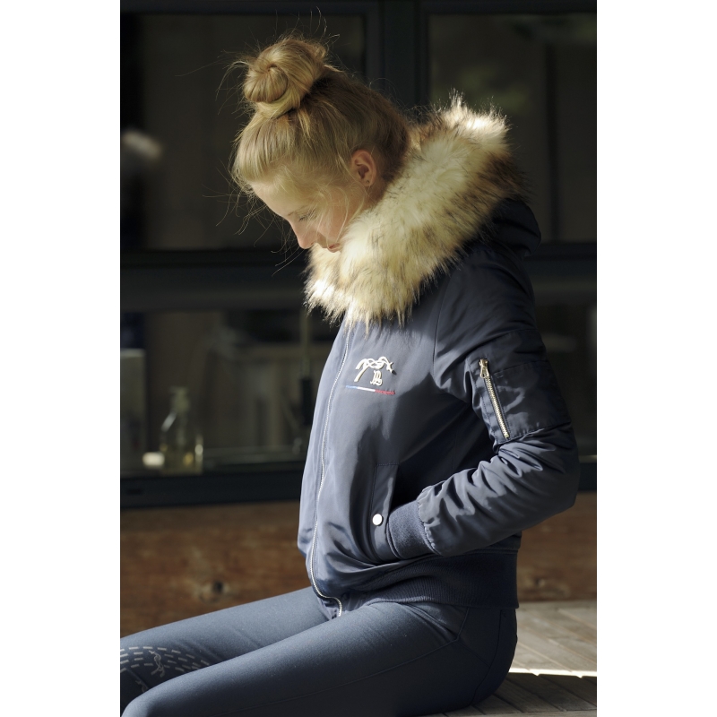 Ce blouson court type bombers est doublé d'une polaire ultra douce et doté d'une bande élastique sur le bas du blouson et les poignets. Il a une fermeture éclair centrale et deux poches sont boutonnées sur le devant. La capuche est intégrée et entourée d'une épaisse fausse fourrure. Ce blouson est déperlant mais pas imperméable.