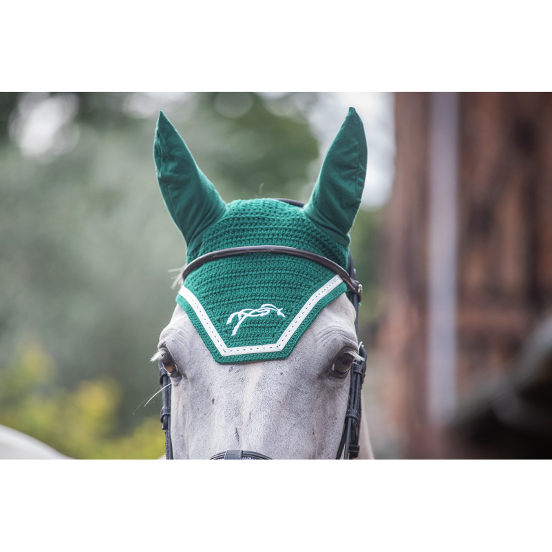 Un bonnet aux oreilles élastiques et souples. Ce bonnet est ce qu'il y a de plus confortable pour votre cheval, pour qu'il ne soit pas perturbé par l'environnement et les insectes lors des concours. En coton crocheté, le bonnet point sellier fly coton est décoré d'un galon blanc sur le contour du chanfrein et la broderie du logo Pénélope est assortie pour plus d'élégance. Sa forme est parfaitement dégagée derrière les oreilles pour pouvoir mettre un bridon anatomique. Il est doté d'une découpe carrée à l'avant. Ce bonnet s'associe parfaitement au tapis point sellier de la même couleur ICI