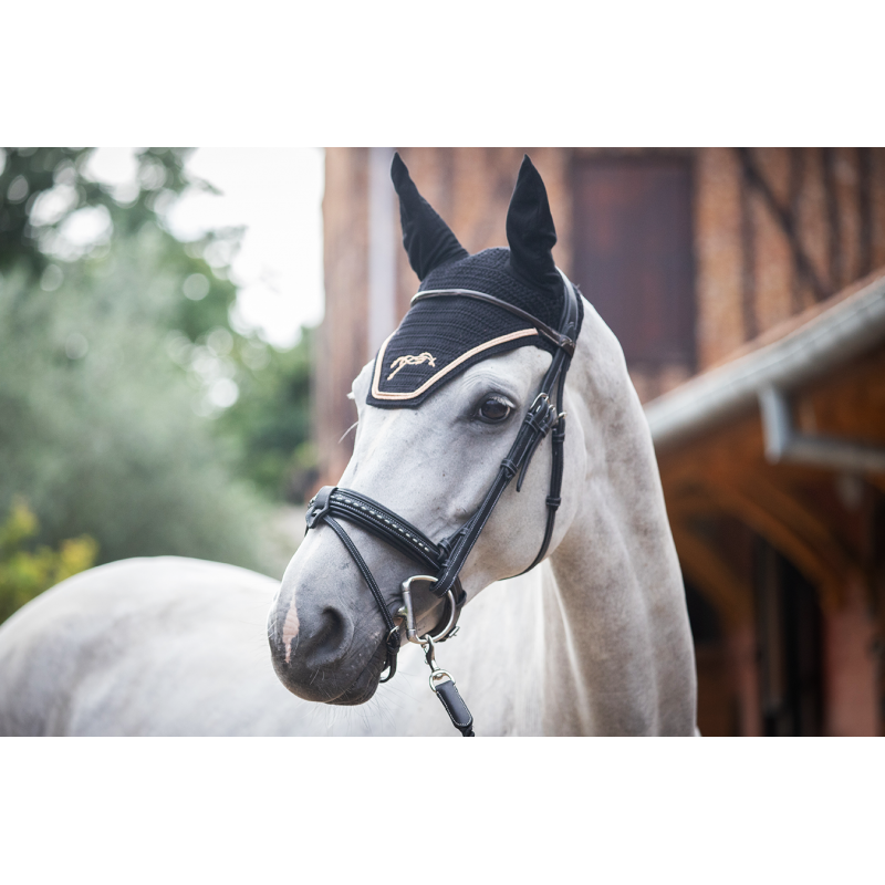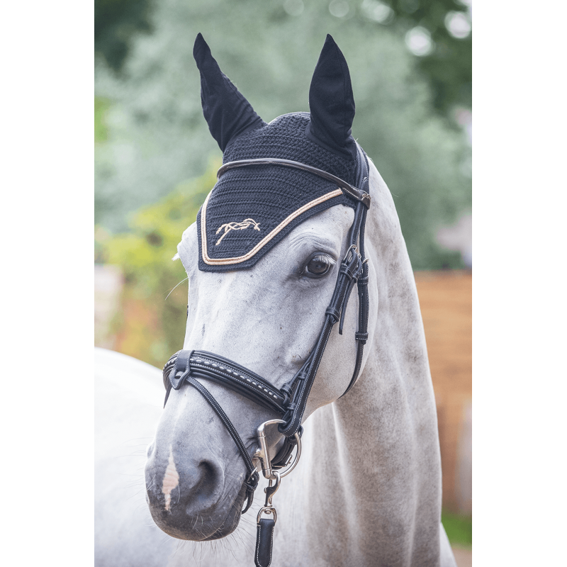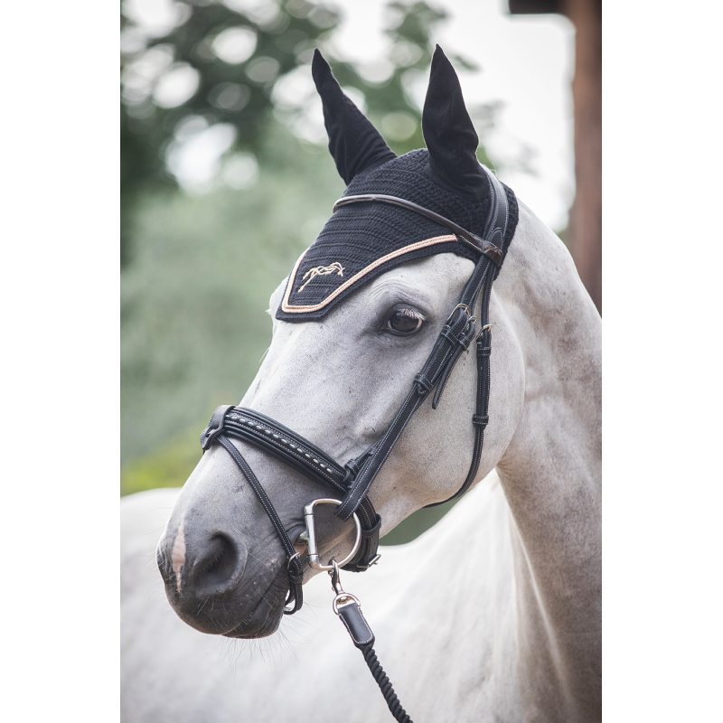 Un bonnet aux oreilles élastiques et souples. Ce bonnet est ce qu'il y a de plus confortable pour votre cheval, pour qu'il ne soit pas perturbé par l'environnement et les insectes lors des concours. En coton crocheté, le bonnet point sellier fly coton est décoré d'un galon rose gold sur le contour du chanfrein et la broderie du logo Pénélope est assortie pour plus d'éléganceSa forme est parfaitement dégagée derrière les oreilles pour pouvoir mettre un bridon anatomique. Il est doté d'une découpe carrée à l'avant. Ce bonnet s'associe parfaitement au tapis point sellier de la même couleur ICI