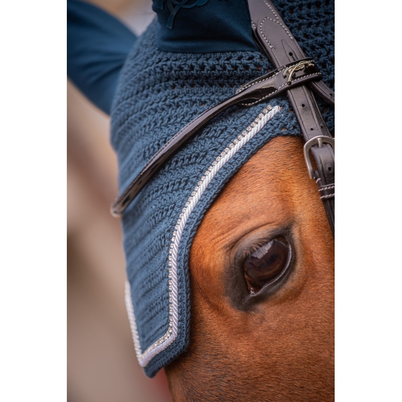 Le Bonnet pour chevaux Diamant des Collections Pénélope est confectionné dans une maille qui se pose parfaitement sur la tête du cheval. Au niveau du chanfrein, une tresse et un rang de strass ornent ce bonnet qui s'assortit parfaitement aux tapis de la même collection.