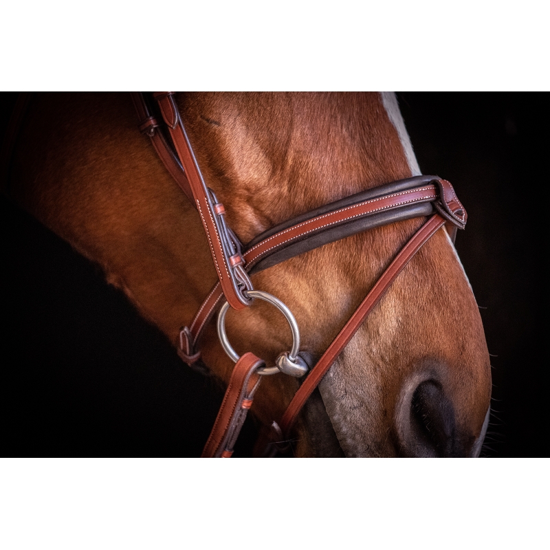 L'élégance et la sobriété de notre bridon US. Sans véritables fioritures, ce modèle va à l'essentiel avec son joli cuir noisette. Ses renforts doublés de matelassures confortables sont en contraste sous la têtière, le frontal et la muserolle combinée avec noseband amovible. Ils permettent de limiter la pression exercée sur le chanfrein et la nuque. Le bridon US Noisette est vendu seul, sans rênes, que vous pouvez choisir entre le modèle tressé et le modèle en caoutchouc.