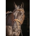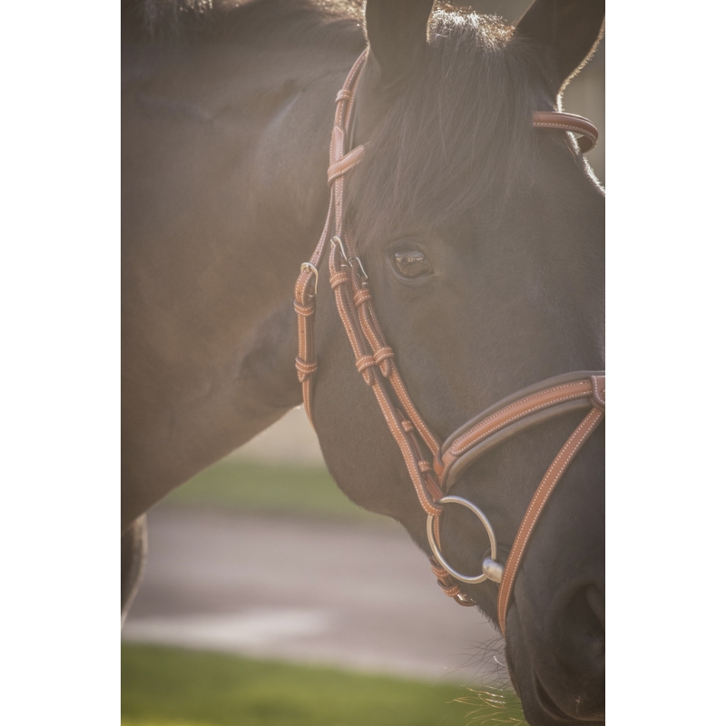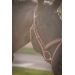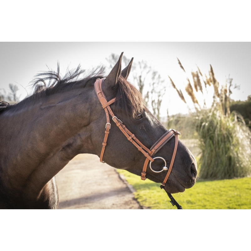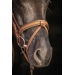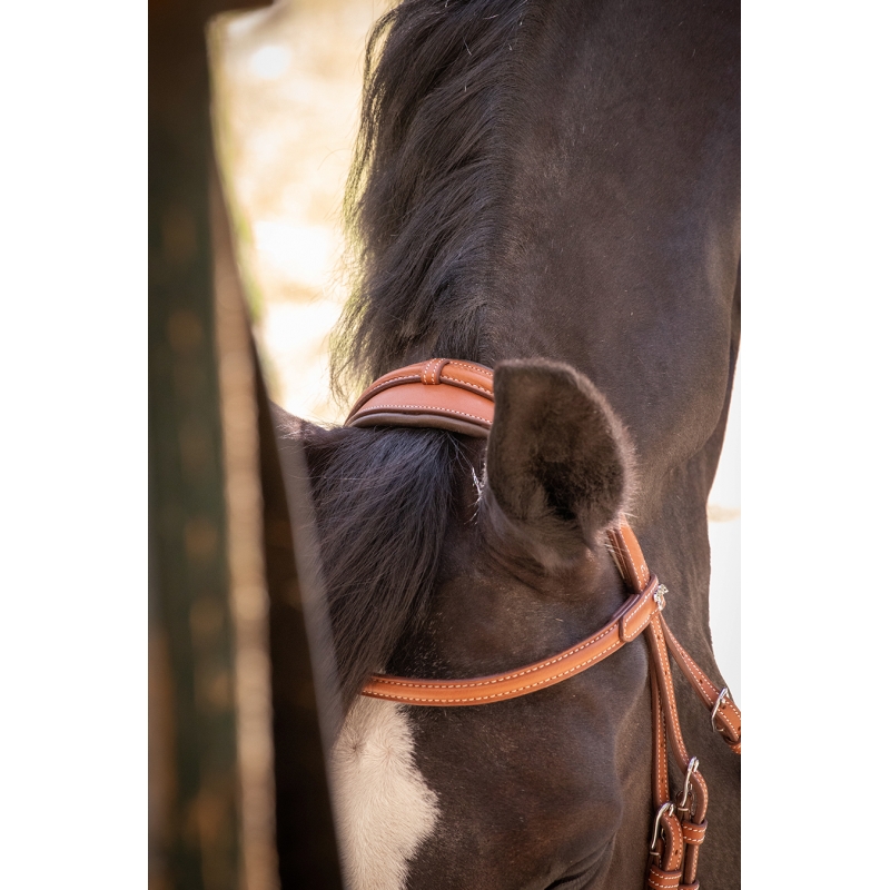 Bridon "Elégance" Pénélope orné de surpiqûres crèmes en contraste. Il est composé d'une muserolle large combinée doublée de cuir souple et d'une têtière anatomique elle aussi doublée de cuir souple sur la zone en contact avec la tête du cheval. Sur le dessus de la têtière se trouve un insert fin décoratif glissé dans des passants en cuir. Le pin's Pénélope argenté est fixé à gauche sur le passant du frontal.