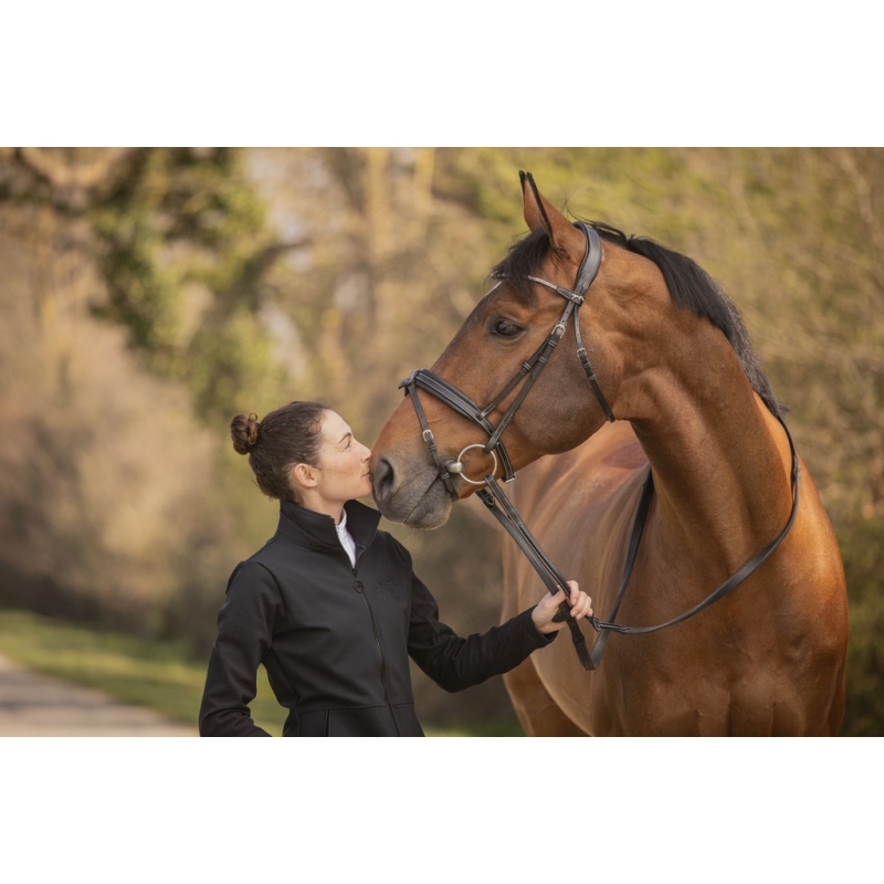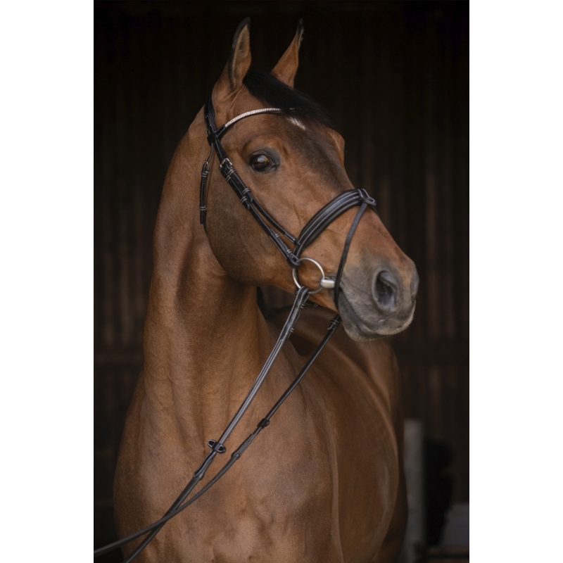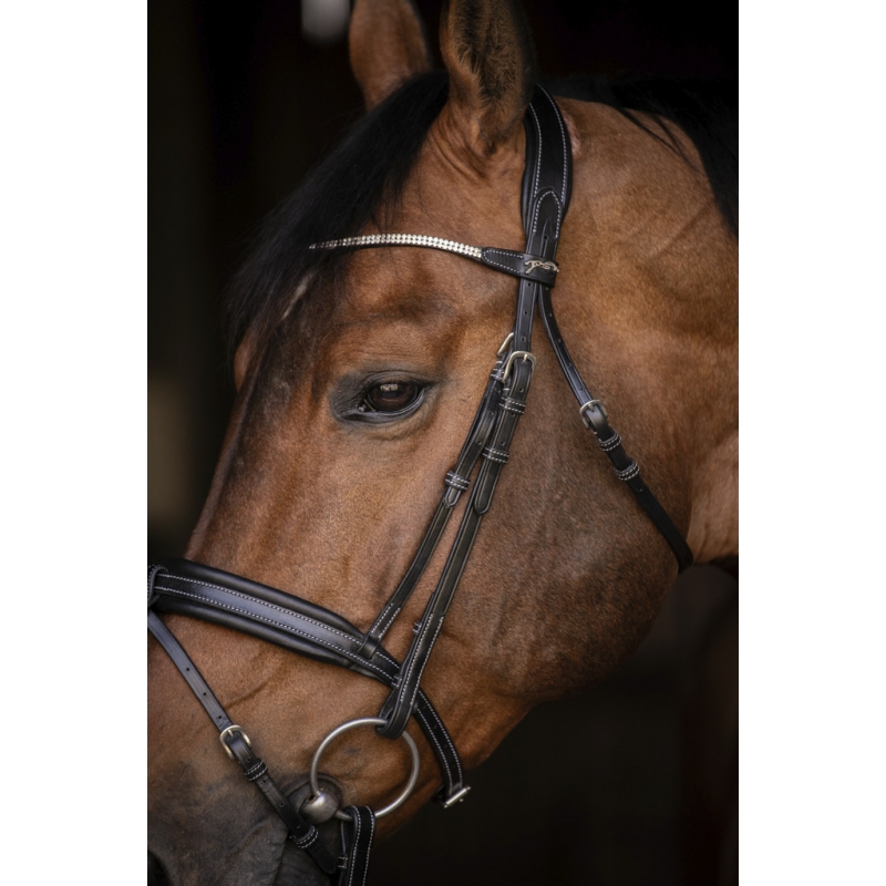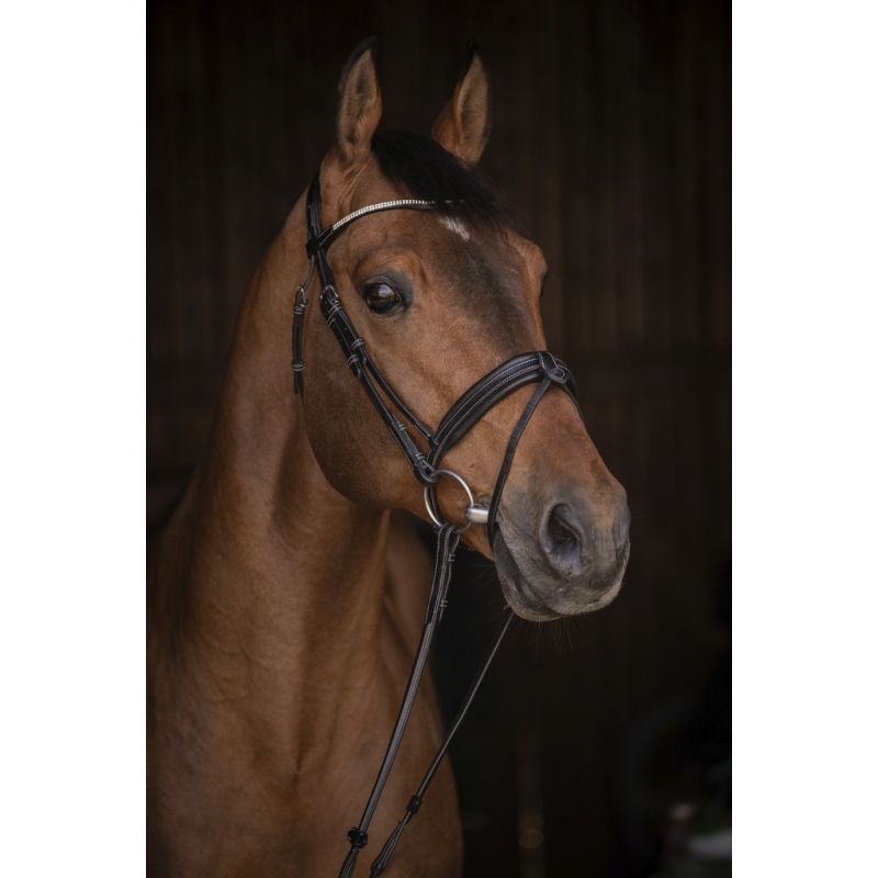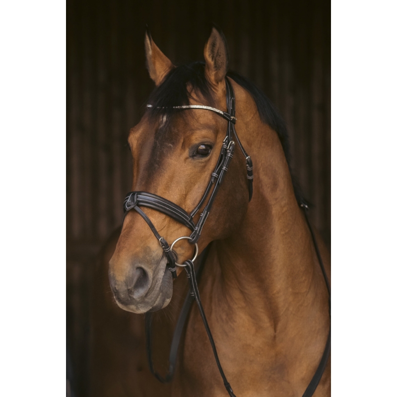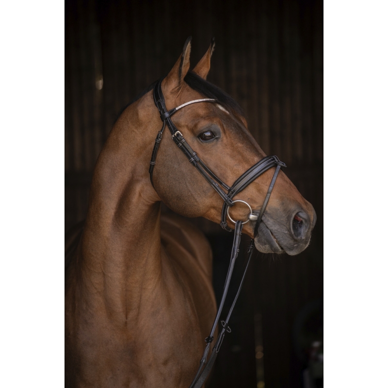 Grâce à son design chic et son frontal scintillant, ce bridon est parfaitement adapté pour les concours hippiques.