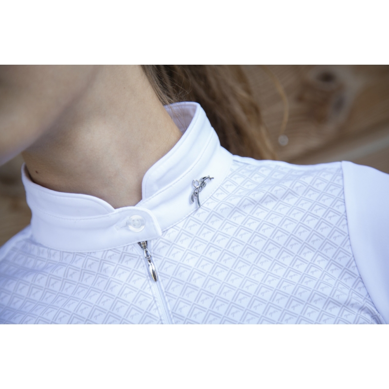 Le Polo de concours Séville manches longues et composé d'un motif en frise du logo Pénélope. Confectionné dans un tissu léger et respirant, il a un col officier blanc, obligatoire pour rentrer en piste et un empiècement blanc qui coupe délicatement l'épaule et dessine une jolie silhouette. Notre polo de concours Séville est déjà disponible en manches courtes.