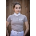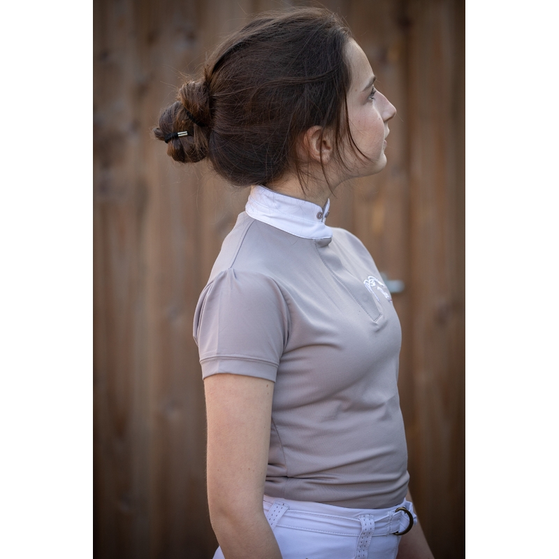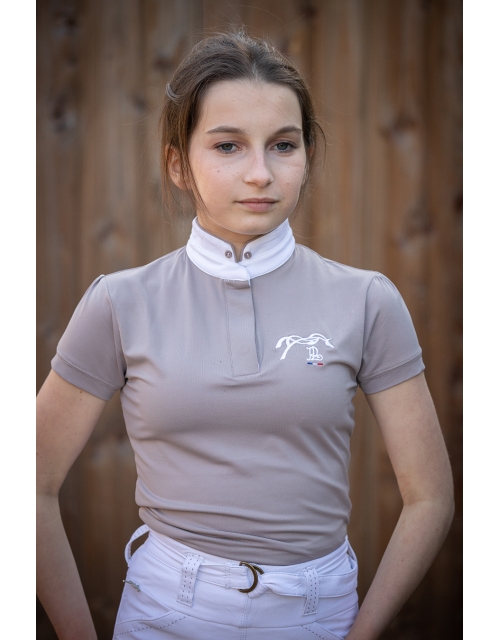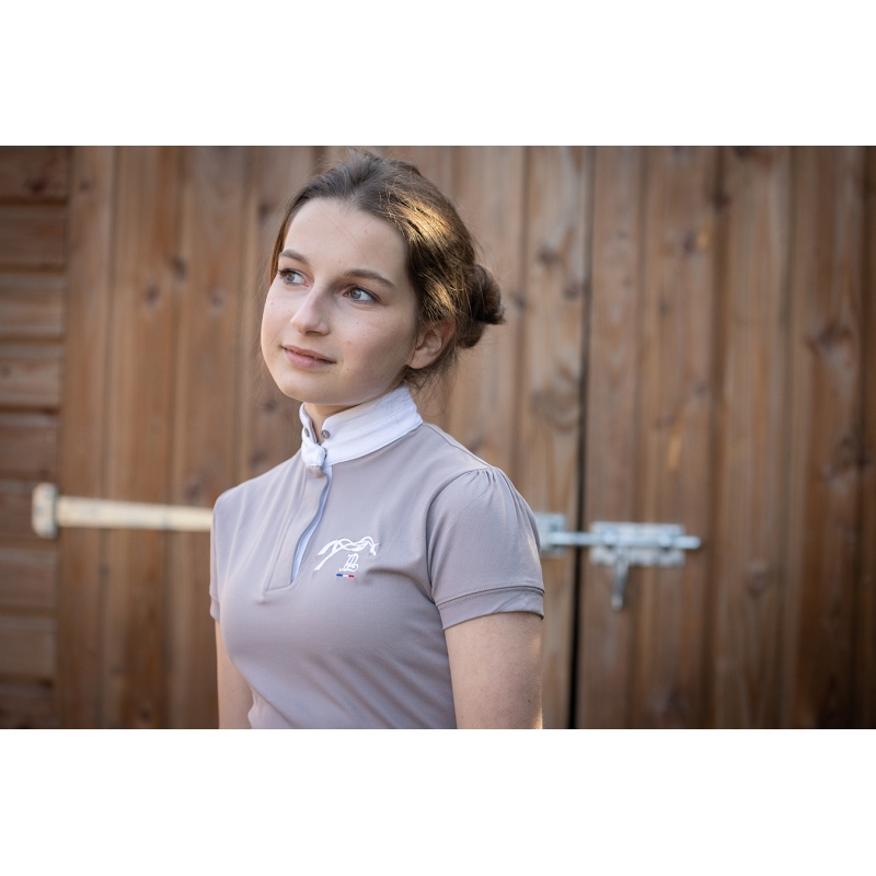 Polo de concours manches courtes légèrement froncées, déjà disponible en blanc depuis plusieurs saisons. Notre polo Madrid se décline désormais en taupe mais garde sa coupe près du corps, son col officier blanc (obligatoire en compétition) et sa petite broderie du logo sur le coeur.