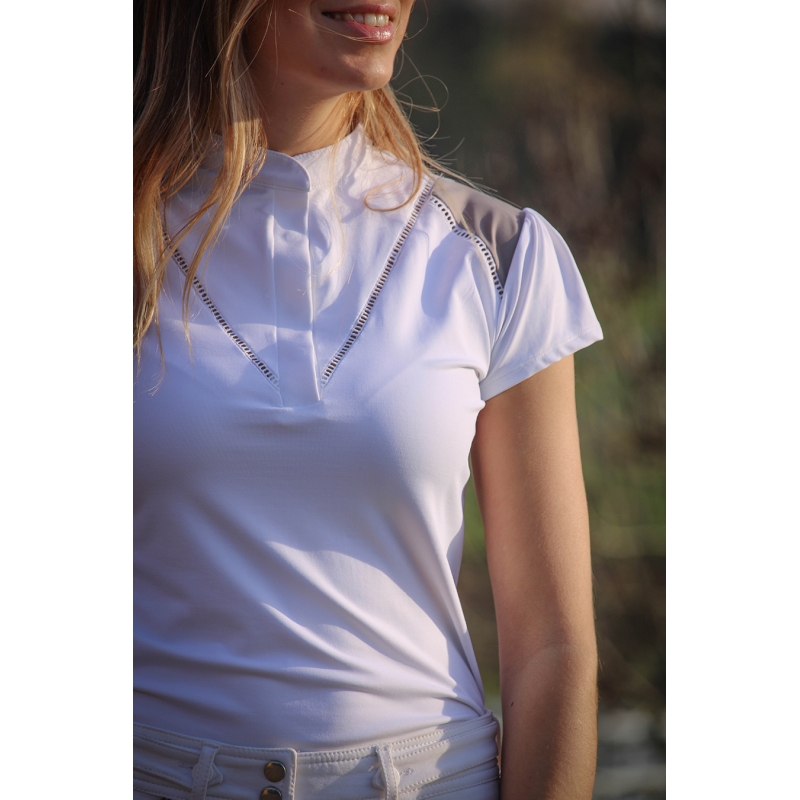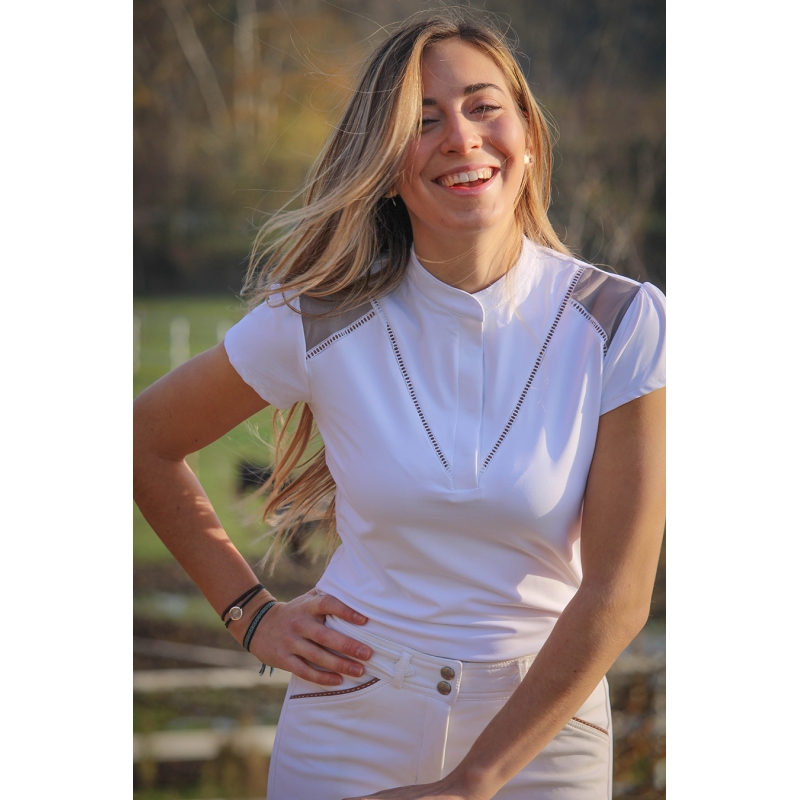 Un polo de concours aux airs savoureusement romantiques arrive chez Pénélope : le polo Venise. Tout en stretch pour un porté agréable et qui libère chaque mouvement de la cavalière, il a des manches courtes légèrement froncées, un col officier assez court fermé par une pression cachée et une encolure qui se ferme aussi, par des boutons cachés. Sur les épaules, on voit deux empiècements taupe, en contraste, délimités par un jour Venise qui apporte une touche très féminine à la pièce. Il est idéal pour toutes les cavalières qui pratiquent la compétition hippique, à porter sous la veste de concours ou seul avec autorisation du jury.