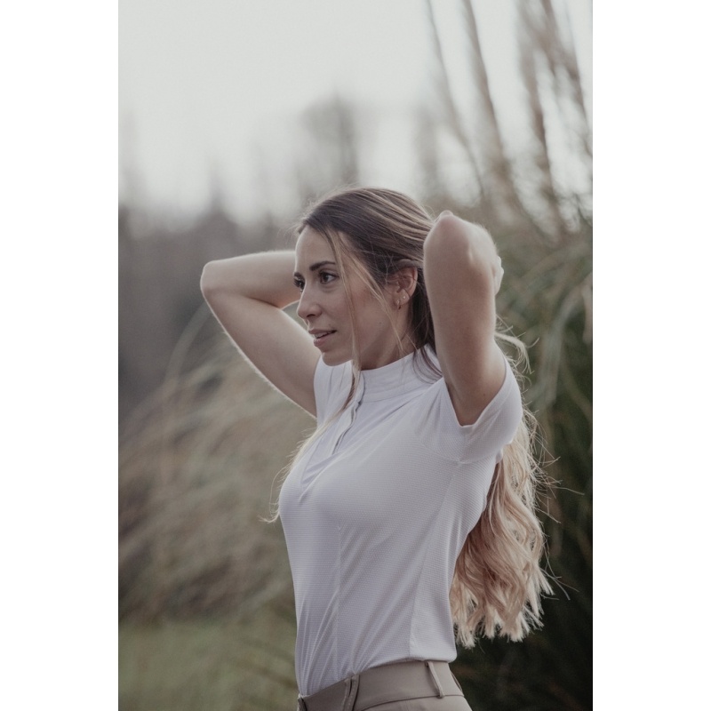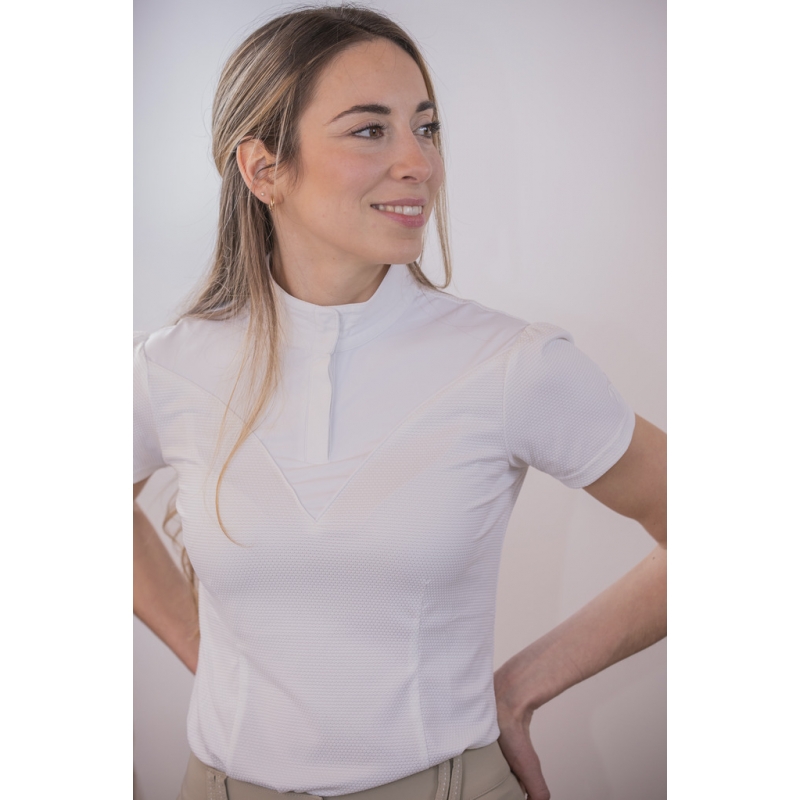 Polo de concours Las Honey manches courtes confectionné dans un tissu alvéolé léger et respirant. Avec son plastron joliment dessiné au dessus de la poitrine, il allie le chic et la technicité nécessaire à la pratique du concours hippique.