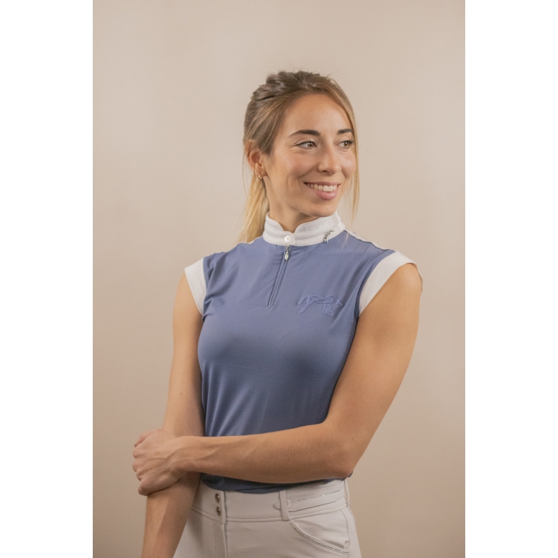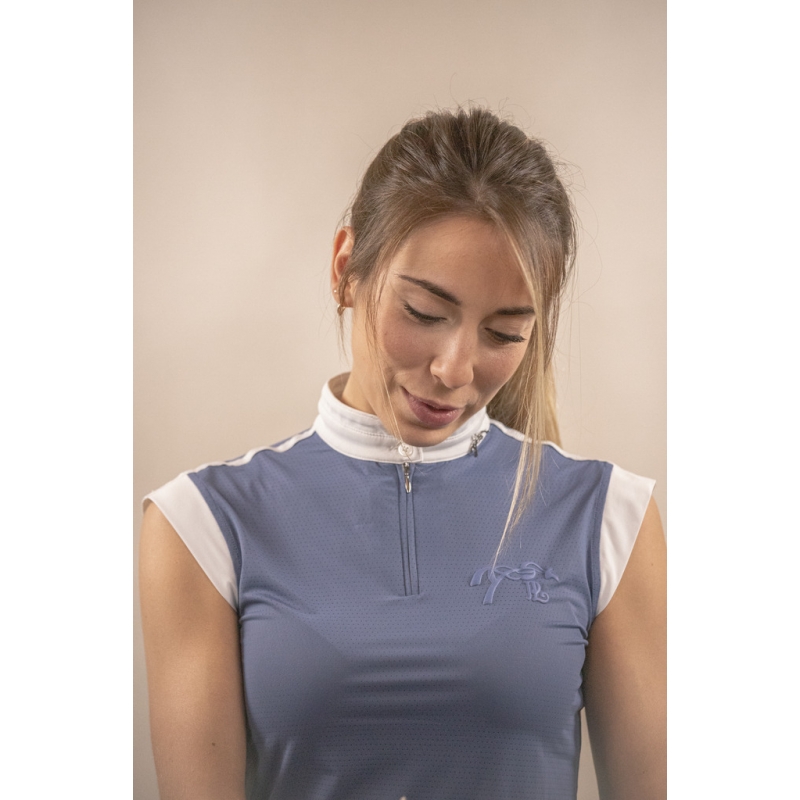 Polo de concours sans manches Séville Mesh. Disponible en bleu gris, il est confectionné dans une matière très légère et stretch pour un confort optimal. Les emmanchures et le col sont blancs en contraste avec le bleu du reste du polo. Très chic, son col officier se ferme à l'aide d'un zip surmonté d'un bouton. Bien ajusté, son col est estampillé d'une petite breloque logotée argentée. Pour rajouter une touche d'élégance, ses petites épaulettes blanches sont surmontées d'un passepoil plat blanc également. Sur le cœur, le logo Pénélope est délicatement brodé ton sur ton.