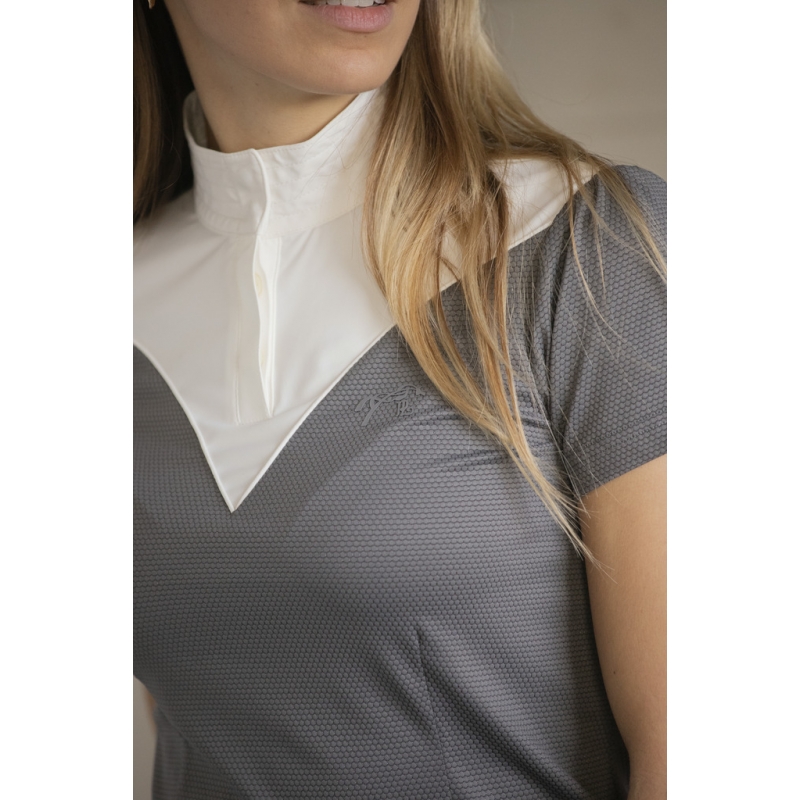 Polo de concours Las Honey manches courtes confectionné dans un tissu alvéolé léger et respirant. Avec son plastron joliment dessiné au dessus de la poitrine, il allie le chic et la technicité nécessaire à la pratique du concours hippique.
