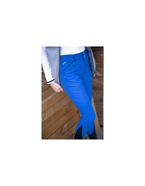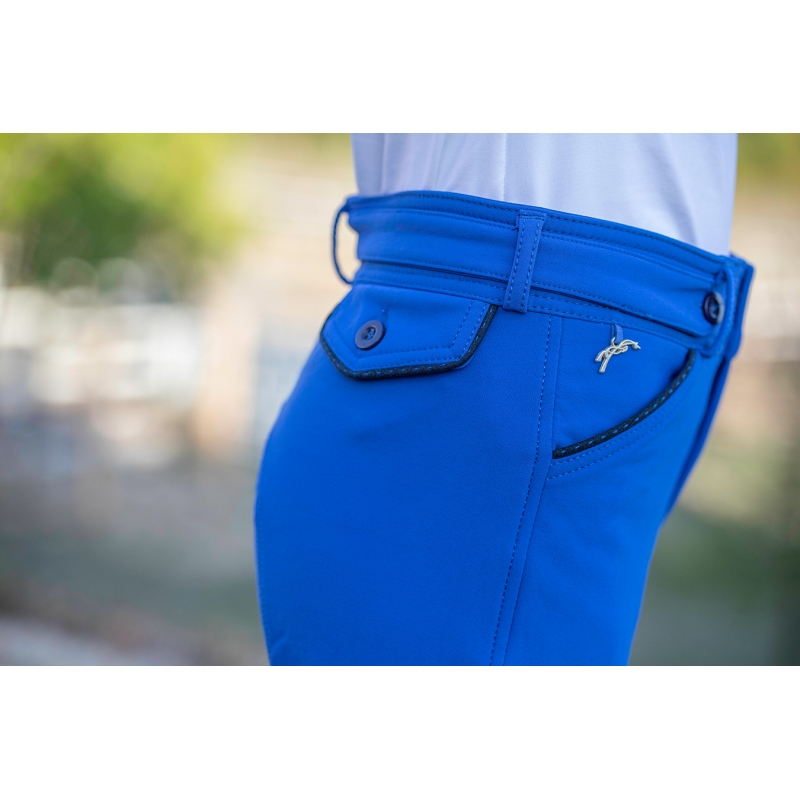 Le pantalon Point Sellier des Collections Pénélope est un des best-sellers de la marque! Le voici qui nous arrive en bleu olympique cette saison et également en taille enfant, ce qui va faire le bonheur de nos plus jeunes cavalières! Le pantalon point sellier est doté de deux vraies poches à l'avant et deux fausses poches à l'arrière, toutes surmontées d'un point sellier marine en contraste. La taille est haute, mais pas trop, Une sur-ceinture amovible dessine la taille et le bas de jambe est en lycra. Malgré les couleurs qui changent chaque saison, le confort, la qualité, la résistance et le chic de ce pantalon d'équitation reste intact.