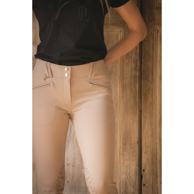 Pantalon d'Équitation Rocky Pénélope. Un pantalon d'équitation confortable et technique pour tous les jours. Sa coupe près du corps et sa taille ni trop haute ni trop basse dessinent parfaitement la silhouette. Il a deux petites poches zippées sur le devant et deux fausses poches à l'arrière. Il est doté d'une ceinture assez large qui favorise un bon maintien à la taille. Il se ferme par deux petites pattes sur le devant et possède des passants de ceinture assez fins. A l'intérieur des genoux, se trouve une zone de grip pour bien fixer la jambe une fois en selle. Les bas de jambes sont composés de lycra pour s'adapter à toutes les morphologies et aux tailles de jambes différentes.