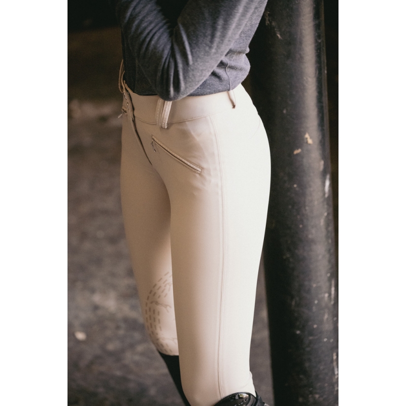 Le pantalon d'Équitation Rocky Pénélope, un pantalon d'équitation confortable et technique pour tous les jours ou les jours de concours. Sa coupe près du corps et sa taille ni trop haute ni trop basse dessinent parfaitement la silhouette. Il a deux petites poches zippées sur le devant et deux fausses poches à l'arrière. Il est doté d'une ceinture assez large qui favorise un bon maintien à la taille. Il se ferme par deux petites pattes sur le devant et possède des passants de ceinture assez fins. A l'intérieur des genoux, se trouve une zone de grip
