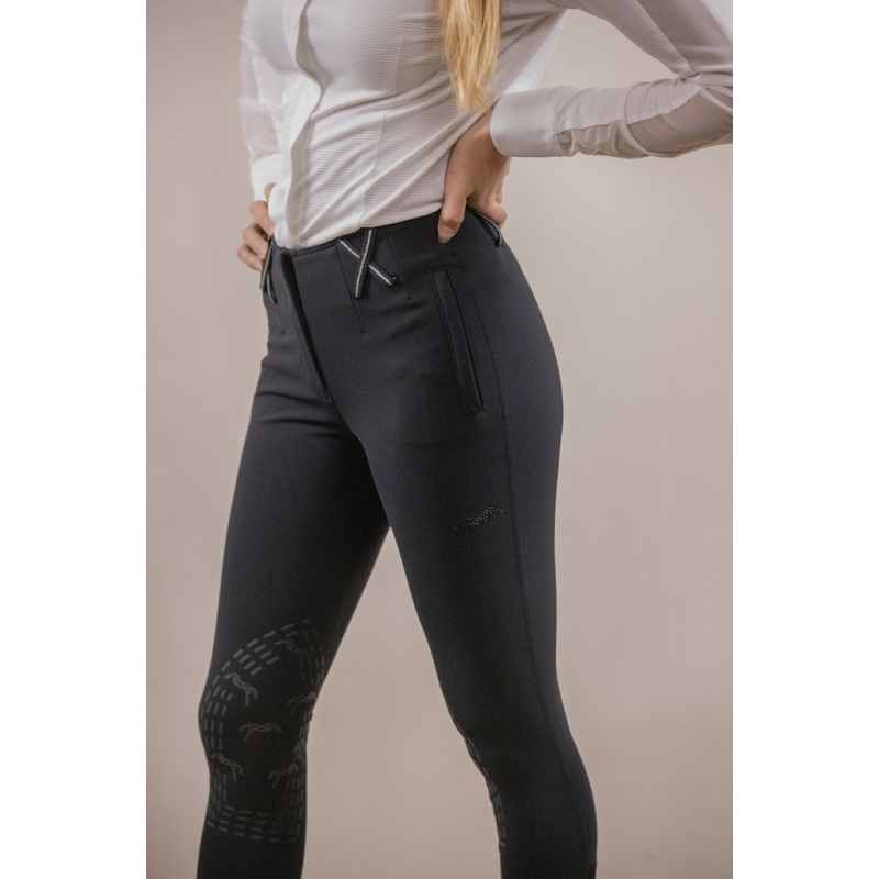 Doté d'une ceinture large à passants en croix et sans boutonnière, le pantalon d'équitation "Zuri" se ferme par un zip sur le devant rehaussé d'un discret petit crochet. Il a également deux poches collées très discrètes à l'avant, fermées par un zip. Encore plus discrète, une petite poche de téléphone, fermée par un zip fin, se distingue sur la jambe droite. A l'intérieur des genoux, des grips en silicone logotés Pénélope renforcent la fixité de la jambe. Les bas de jambes sont en lycra pour plus de confort et s'adaptent à de nombreuses tailles et morphologies. Très confortable, il a ce look original 100% Pénélope qui sort du lot pour la saison 2024 !