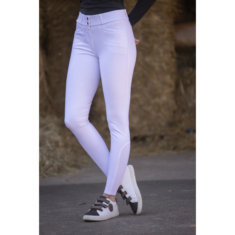 Le pantalon d'équitation Majestic est confectionné dans un tissu doux, léger et confortable. Original, on retrouve le logo Pénélope en perforé sur chacune des poches à l'avant. Le bas de jambes perforé pour accentuer la respiration et il est sans couture à l'extrémité pour le confort. À l'intérieur des genoux, le logo Pénélope apparait en silicone comme un grip, pour améliorer la fixité de la jambe du cavalier. Il a deux poches à l'avant et deux fausses poches à l'arrière. Le passant de ceinture à l'arrière est croisé et sa taille est bien ajustée. Il convient à toutes les cavalières à la recherche de confort, de légèreté et d'un look sobre discrètement signé des collections Pénélope.