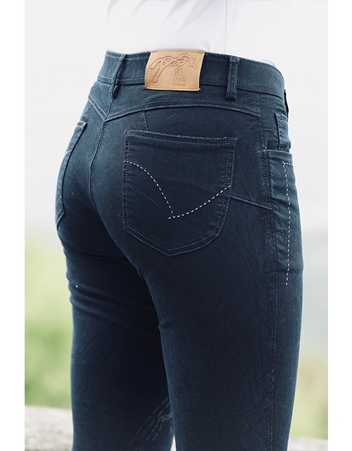 Le pantalon Denim, ou le pantalon d'équitation aussi pour la ville. Des surpiqûres autour des poches, une étiquette à l'arrière droit en imitation cuir marquée du logo, un silicone ton sur ton, un léger lycra à la cheville et le tour est joué ! Comme son cousin, le jean skinny, il reste près du corps. Il garde son confort grâce à un tissu composé d’élasthanne.