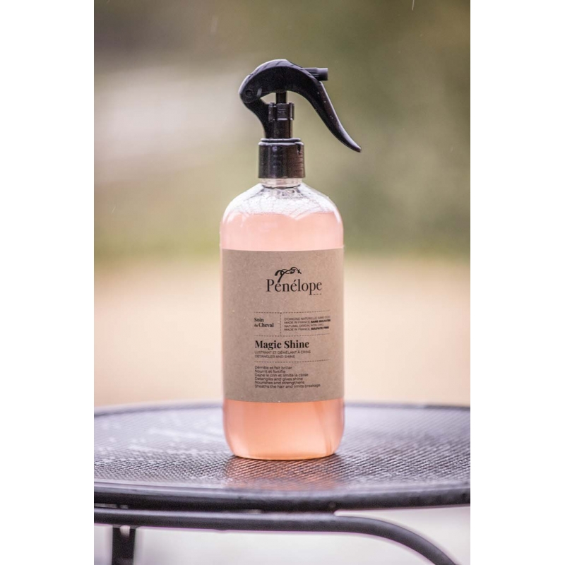 Le Spray lustrant et démêlant pour chevaux "Magic Shine" Pénélope démêle et fait briller les crins. Il nourrit et fortifie le crin grâce à sa formule à base de protéine de soie et de provitamine B5. Ce soin est adapté au pH naturel de la peau du cheval. D'origine naturelle, sans OGM, made in France, sans sulfates, il gaine le crin et limite la casse.