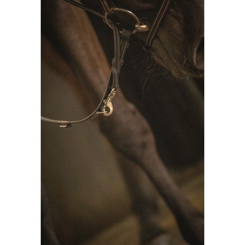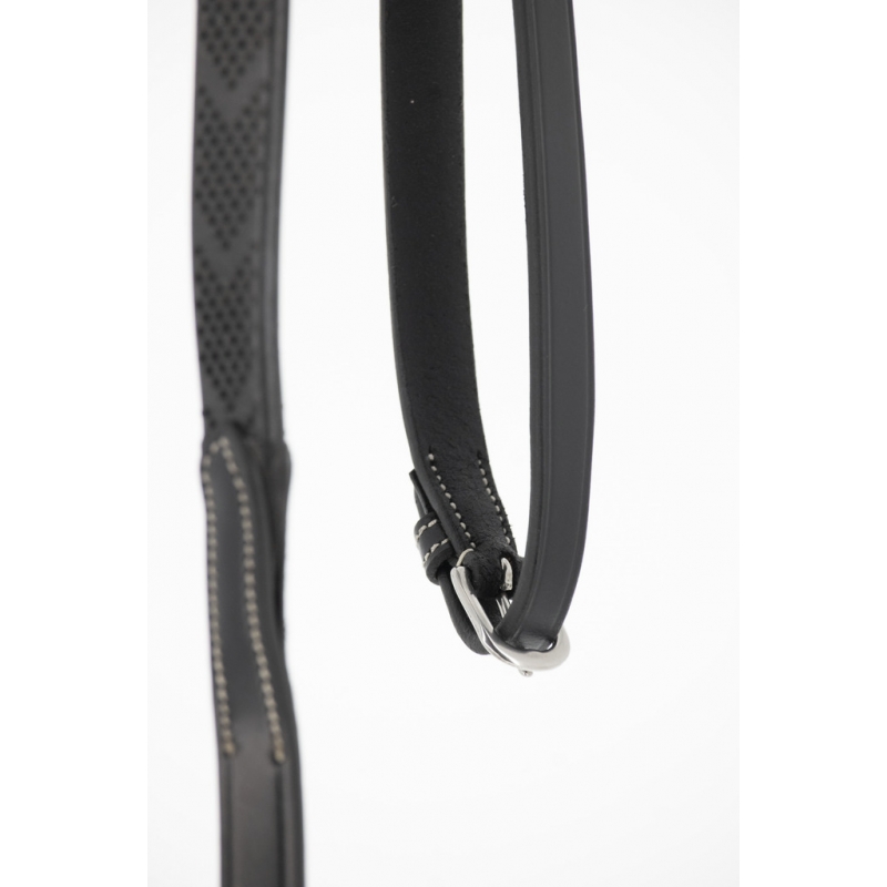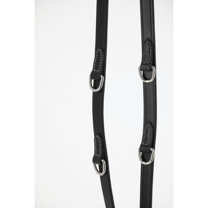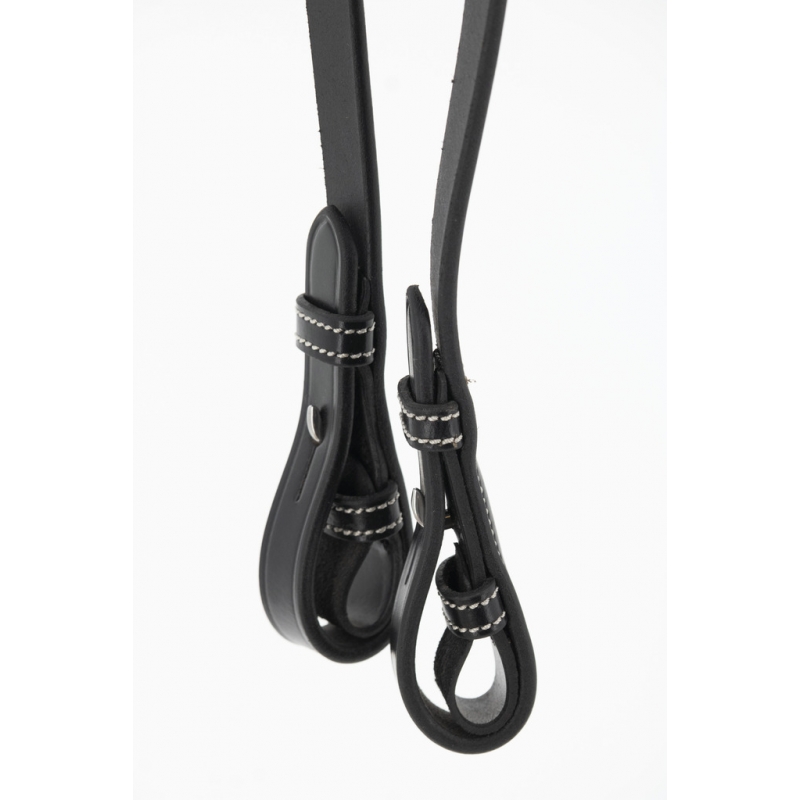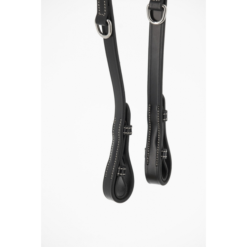 Rênes Howlett Pénélope en cuir et caoutchouc dotées de deux anneaux permettant deux réglages différents. Elles s'utilisent parfaitement bien avec notre Martin Collier.