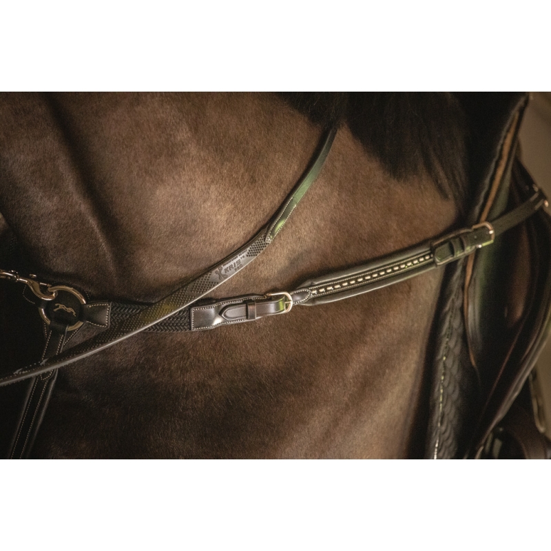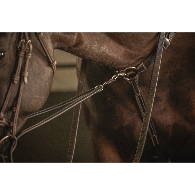 Enrênement Howlett Pénélope compatible avec notre martin collier. Il se fixe sur l'anneau central du martin collier, et permet au cheval de travailler en montant sa ligne de dos. Lorsque le cheval cède, l'enrênement Howlett cède lui aussi et permet d'éliminer les nuisances de la main du cavalier. Il s'utilise avec notre paire de rênes Howlett Pénélope.