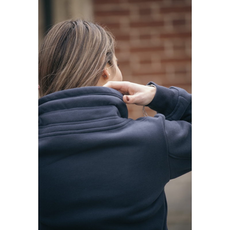 Le sweat Pénélope Native Strass est un modèle zippé sur le devant et constitué de deux poches également zippées. Un col montant particulièrement confortable est rehaussé par deux cordons larges ton sur ton marine. Le bas de la taille et le tour des deux poignets confectionnés en bord-côtes élastiques ajoutent une touche supplémentaire de confort. Enfin, un rang de strass marine suit harmonieusement les courbes de la broderie 3D du logo Pénélope visible sur le devant.