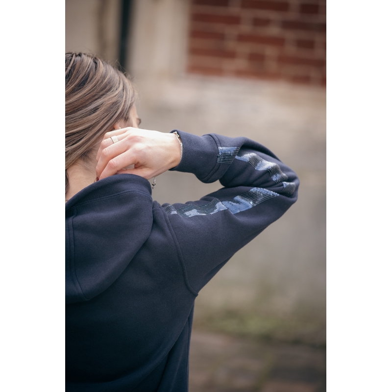 Sweat-shirt à capuche doté de deux poches ouvertes sur le devant. Il a également des bandes élastiques autour des poignets et de la taille. Sa capuche se resserre grâce à deux cordons de serrage rouges avec un embout vert émeraude. Une jolie broderie avec la phrase "Believe in your equestrian dream" et le logo Pénélope en sequin sont visibles sur le devant. Ni trop épais, ni trop fin, il s'adapte à toutes les saisons aux écuries, comme en ville.