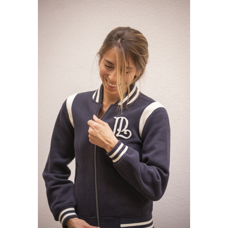Sweat Pénélope "University" dessiné comme un teddy avec ses multiples détails reconnaissables : ses inserts blancs en haut des manches, le col plat, le bas du sweat rayés et ses broderies Pénélope en bouclettes sur le cœur et dans le dos. Il se ferme grâce à un joli zip et se porte aussi bien sur un pantalon d'équitation aux écuries que sur un jean, en ville.