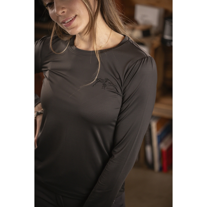 T-shirt Techty technique confectionné dans un tissu micro-aéré respirant et ultraléger, spécifiquement étudié pour la pratique des sports équestres ou autres sports. Il possède des manches longues surmontées de petites fronces aux épaules. Il a un col rond joliment dessiné et un marquage du logo Pénélope en strass sur le cœur.