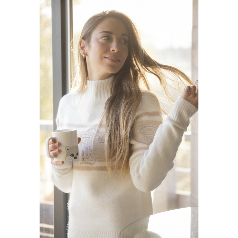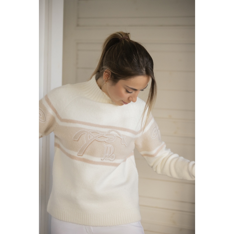 Le Pull Noris des collections Pénélope à un col cheminée et confectionné dans une maille bicolore très douce. Il a une broderie Pénélope sur le devant et deux autres en forme d'arabesque sur les manches.
