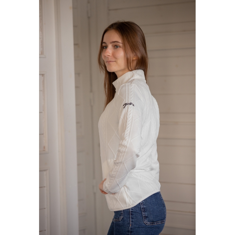 Le Pull Violette des Collections Pénélope type camionneur possède un zip sur le devant et un col montant. Il est confectionné dans une très jolie maille torsadée et le logo Pénélope apparaît en broderie sur le haut du bras gauche.