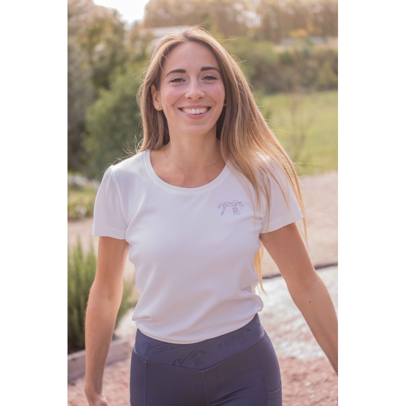 Le t-shirt Techty Honey est confectionné dans un tissu technique micro-aéré respirant. Ultraléger et légèrement gaufré, il est original et sobre à la fois et spécifiquement étudié pour la pratique du sport équestre ou d'autres sports. Il possède des manches courtes rehaussées de petites fronces et un marquage du logo en strass sur le cœur.