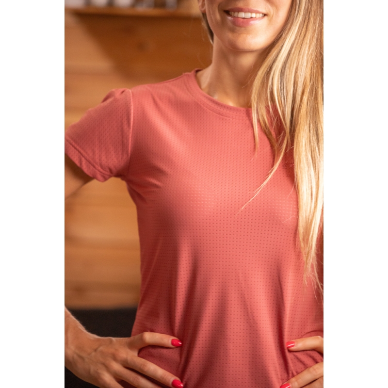 T-shirt technique à manches courtes, le T-shirt Techflo des Collections Pénélope est confectionné dans un tissu micro perforé incroyablement souple et doux. Il possède un col rond et deux fronces au niveau des épaules ce qui lui donne un look très féminin. Sur le cœur, le logo Pénélope est flocké ton sur ton.