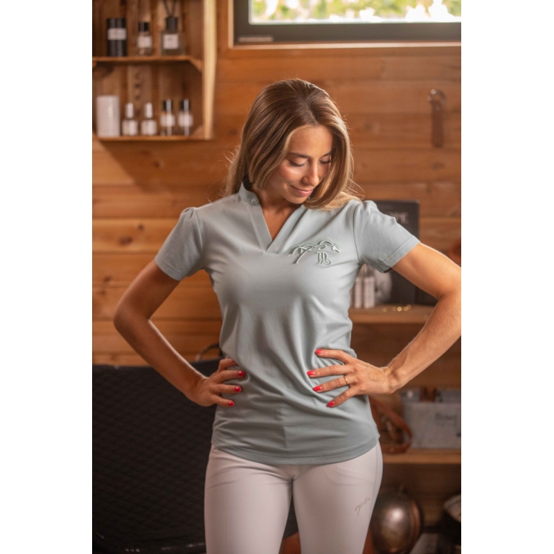Le Polo Josie à manches courtes est féminin et fabriqué dans une jolie couleur vert sauge. Il possède un col V surmonté d'un col officier chic et bien dessiné. Il est marqué d'une broderie en 3D du logo Pénélope accompagné d'un rang de strass sur le cœur. Les manches courtes ont de petites fronces qui dessinent parfaitement les épaules. Le tissu en piqué de coton légèrement stretch dans lequel le polo Josie est confectionné est particulièrement léger et confortable à porter.