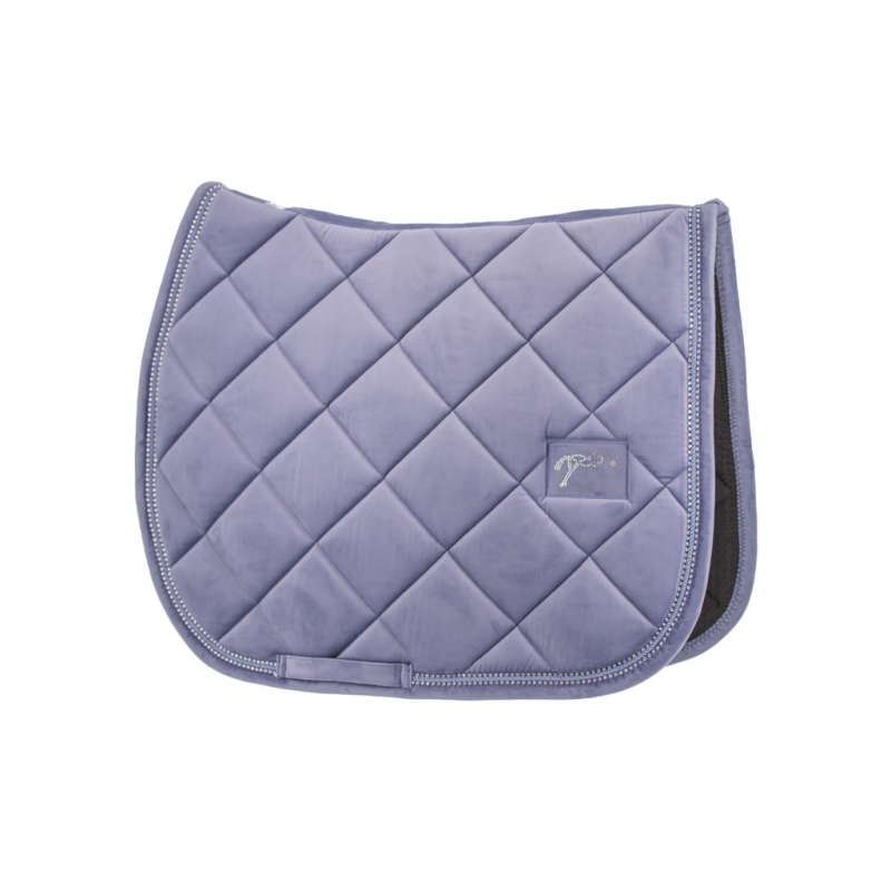 Tapis de selle New Strass matelassé en losange. Confectionné dans un tissu effet velours, il est orné d'un galon torsadé et d'un rang de strass. Le logo Pénélope est lui aussi en strass et visible dans un rectangle ton sur ton à l'arrière gauche du tapis. Bien épais, son matelassage en losange le rend très chic. Sa ligne de dos est bien dégarrottée et il est doté d'un passant de sangle de chaque côté pour une meilleure fixité sous la selle.