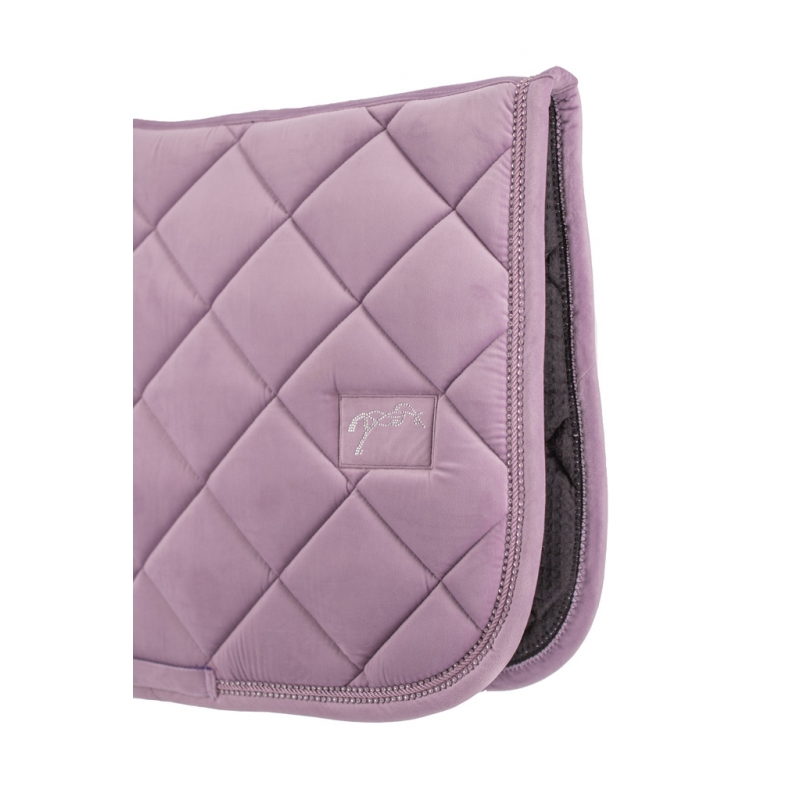 Tapis de selle New Strass matelassé en losange. Confectionné dans un tissu effet velours, il est orné d'un galon torsadé et d'un rang de strass. Le logo Pénélope est lui aussi en strass et visible dans un rectangle ton sur ton à l'arrière gauche du tapis. Bien épais, son matelassage en losange le rend très chic. Sa ligne de dos est bien dégarrottée et il est doté d'un passant de sangle de chaque côté pour une meilleure fixité sous la selle.
