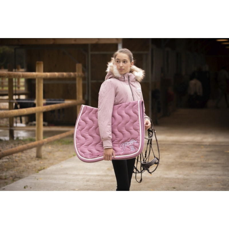 Ce tapis de selle est orné d'un galon point sellier caractéristique de la marque Pénélope et est doté d'un matelassage épais. Très confortable pour le cheval, il a une doublure intérieure en nid d'abeilles alvéolé qui laisse l'air circuler, absorbe et évite un excès de transpiration. Sa coupe bien dégarrottée permet une pose facile. La forme du tapis s'adapte parfaitement au dos du cheval. Il est également doté de deux passants de sangle pour qu'il ne bouge pas sous la selle. On retrouve le Logo PL sur le coté gauche du tapis.