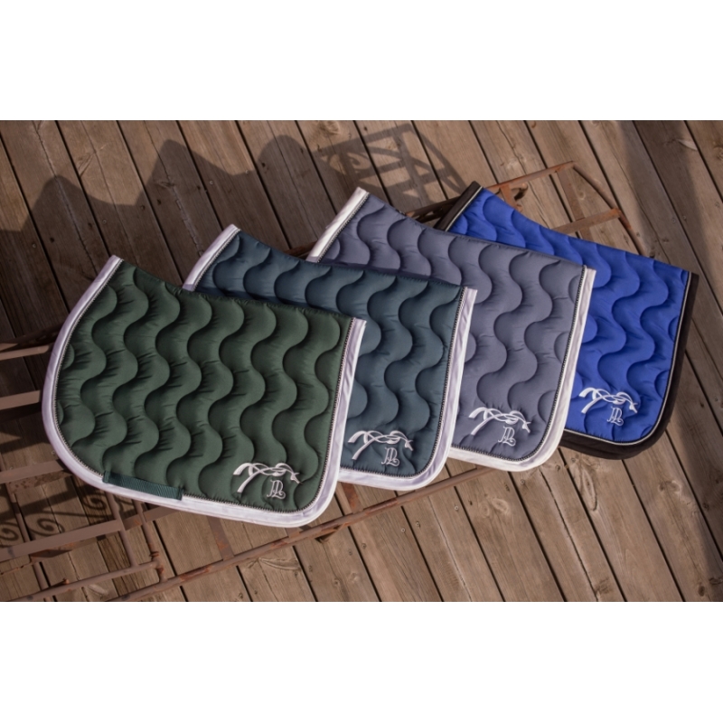 Le tapis de selle Diamant se distingue par son matelassage en vagues, son galon rehaussé d’une fine tresse et son contour délicatement orné de strass. Il a une belle ligne de dos bien dessinée pour faciliter le dégarrottage et un matelassage épais pour préserver le dos du cheval. Doublé en un tissu nid d'abeilles respirant qui absorbe la transpiration du cheval, il apporte un maximum de confort pendant le travail. Il possède également deux passants de sangle de chaque côté pour assurer sa bonne fixité sous la selle. À l'arrière, une jolie broderie Pénélope se distingue des deux cotés.