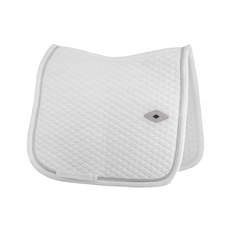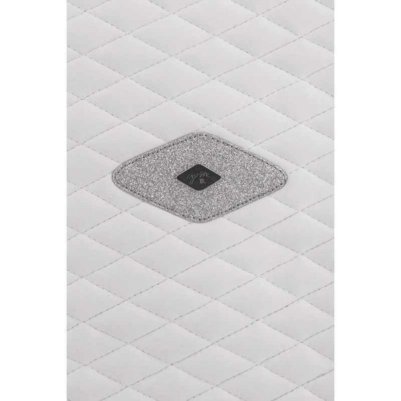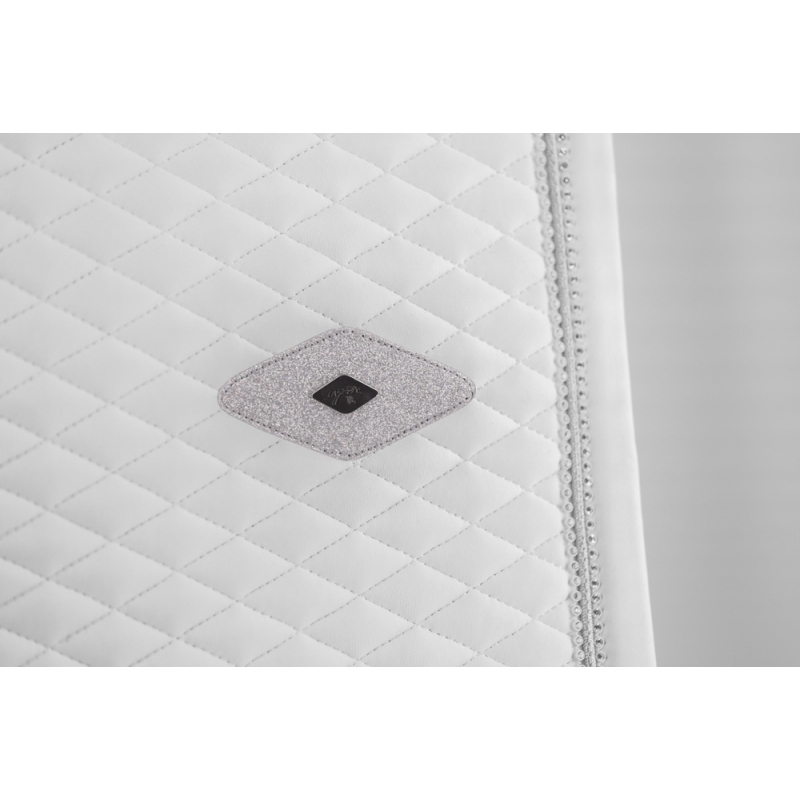 Le tapis de selle Calisson version dressage possède un fin et confortable matelassage en losange horizontal. Il est galonné d'un double rang de strass et doté d'un insert en losange glitter dans lequel on retrouve un pin's Pénélope argenté en losange 3D ton sur ton à l'intérieur.