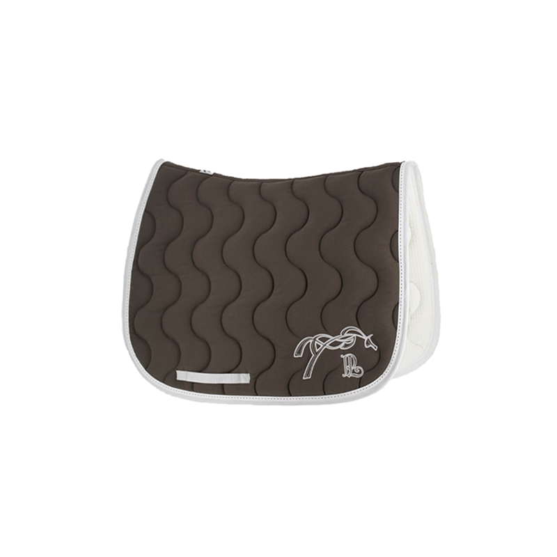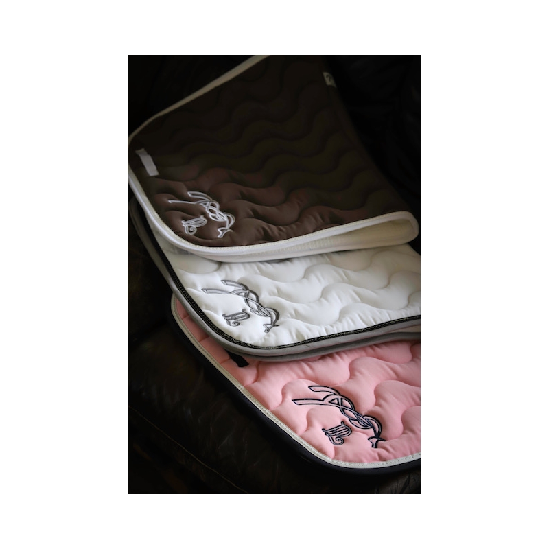 Le tapis de selle point sellier taupe et blanc est un tout nouveau coloris pour la saison 2020-2021. Il conserve toujours la ligne habituelle des tapis de la marque. Il est doté d'un matelassage épais qui protège le dos du cheval contre les chocs pendant le travail. La ligne de dos bien dessinée garantit un bon dégarrotage. Deux passants de sangle évitent que le tapis ne glisse sous la selle pendant le mouvement. Très confortable pour le cheval, le tapis a une doublure intérieure en nid d'abeille alvéolé qui laisse l'air circuler, absorbe et évite un excès de transpiration. Logo PL sur le côté gauche du tapis