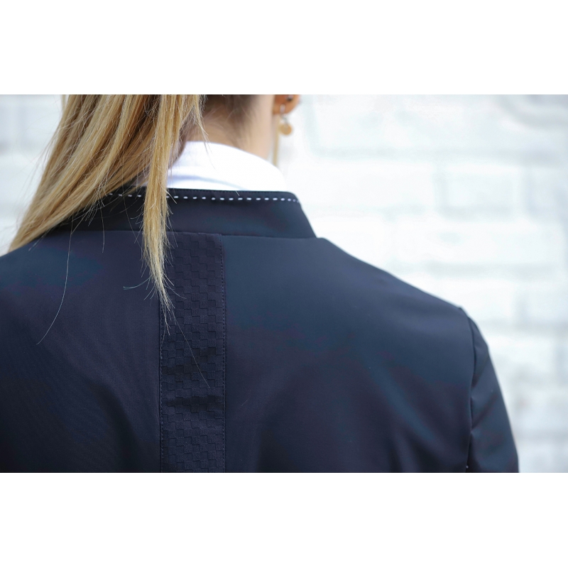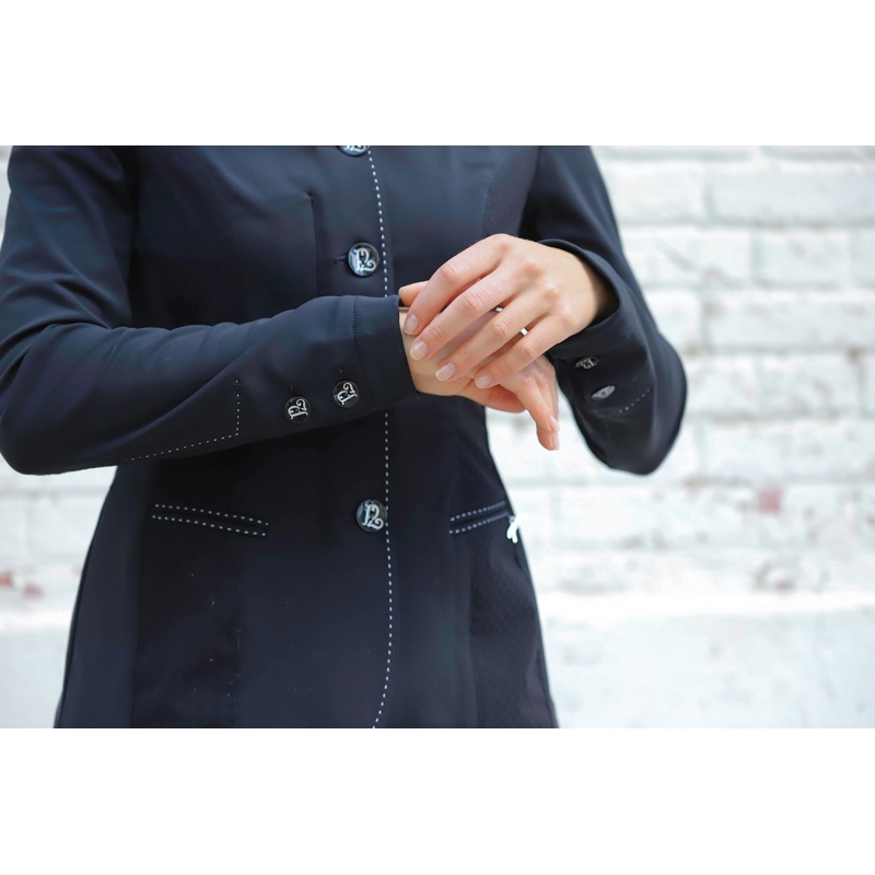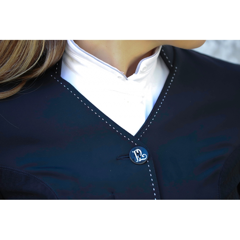 La veste de concours Pénélope baptisée New York a une toute nouvelle découpe d'encolure. La matière a techniquement évolué et se compose d'un tissu ultra-élastique pour un confort inégalé. Dans le dos et sur le devant, des bandes décoratives en tissu ton sur ton assurent une dose supplémentaire d'élégance. Ce nouveau modèle est donc l'association idéale entre le confort et un nouveau look qui permettra de vous éloigner du traditionnel col des vestes de concours. La veste de concours New York a quatre boutons et une fermeture éclair pour la fermer sur le devant et deux boutons décoratifs à chaque poignet. Ces boutons sont en nacre et on y retrouve le monogramme PL. Sa coupe, strictement identique à l'iconique veste de concours Point Sellier, dessine bien la ligne du dos et la courbe de la taille. Deux fentes plates sont à l'arrière pour une liberté de mouvements totale en selle.