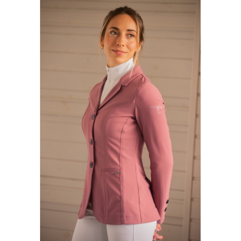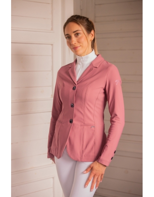 Veste de concours Calista Pénélope au look très sobre et adaptée à la pratique de l'équitation en compétition. Près du corps, elle est confectionnée dans un tissu stretch très confortable. Elle se ferme grâce à un zip caché par trois boutons ton sur ton et possède deux fausses poches dont une est rehaussée par une petite breloque Pénélope argentée. En bas des manches, on retrouve une boutonnière plus petite et à nouveau ton sur ton. En haut du bras gauche, un petit strass Pénélope est délicatement apposé et finit parfaitement cette veste de concours à la fois élégante et très technique.
